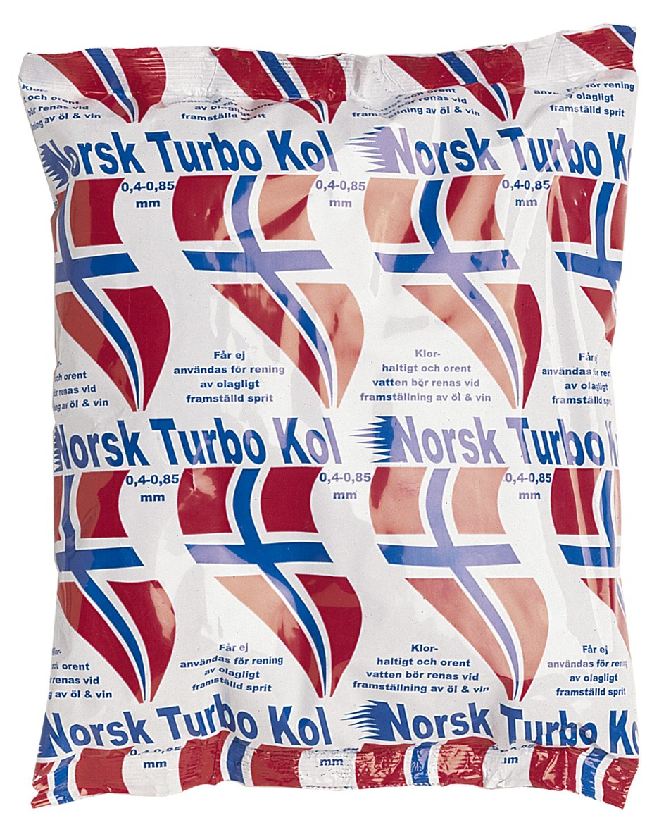 Norsk Turbokol av superb kvalité. Aktivt kol används till att rena klorhaltigt och orent vatten och används med fördel vid framställningen av öl och vin. Det norska turbokolet rengör effektivt och har en kornstorlek på 0,4-0,85 millimeter. Norsk Turbokol får ej användas för rening av olagligt framställd sprit.