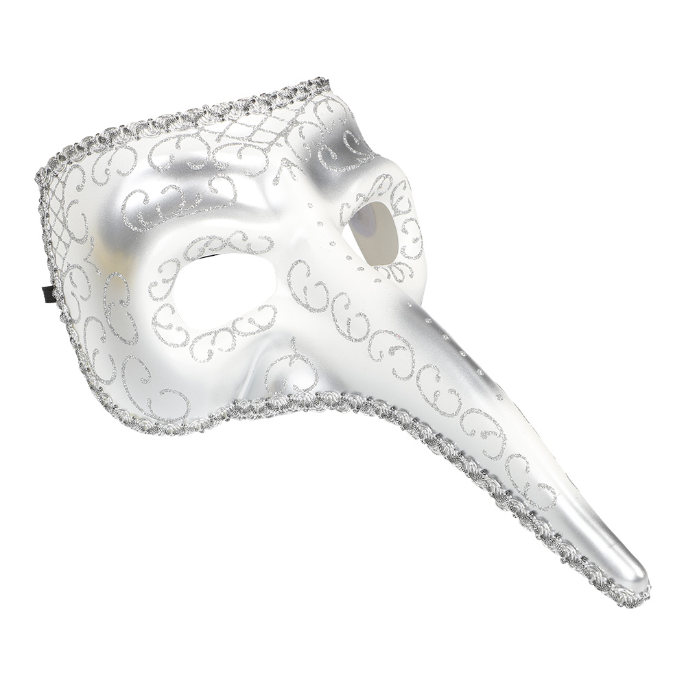Halvmask med lång näsa och silverdetaljer.