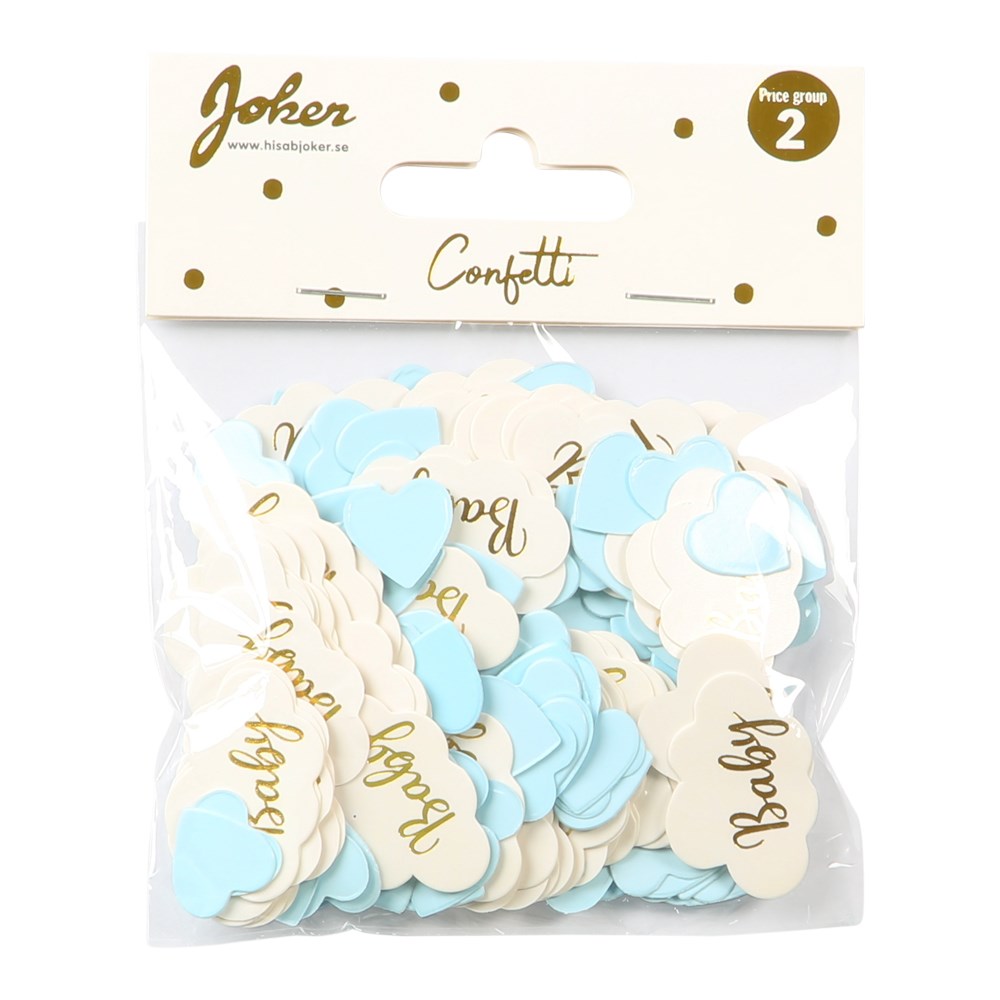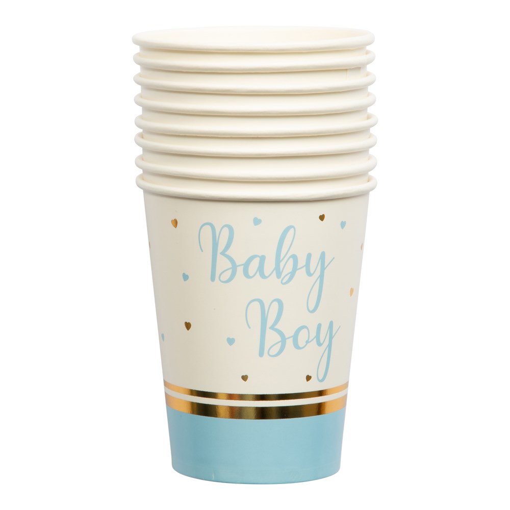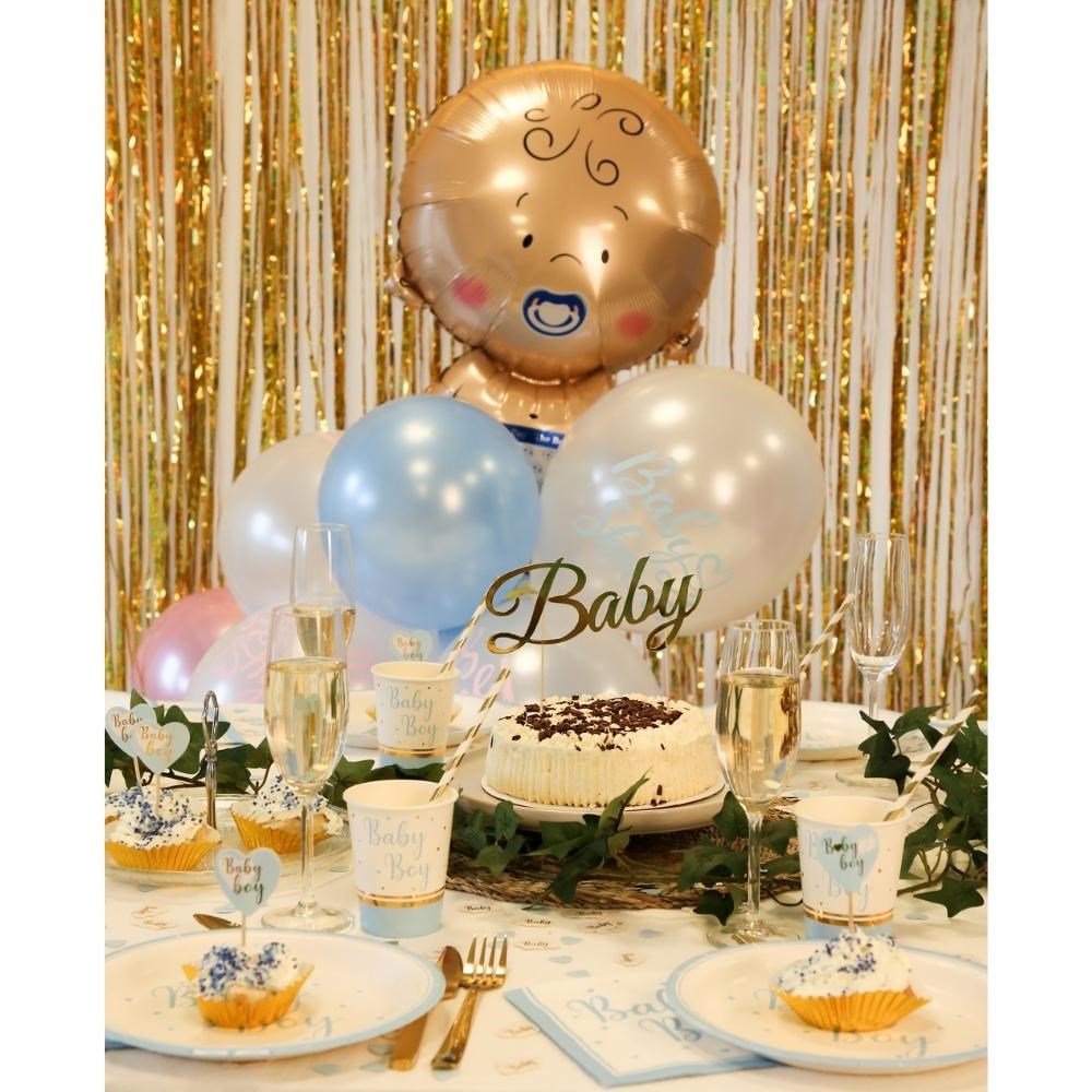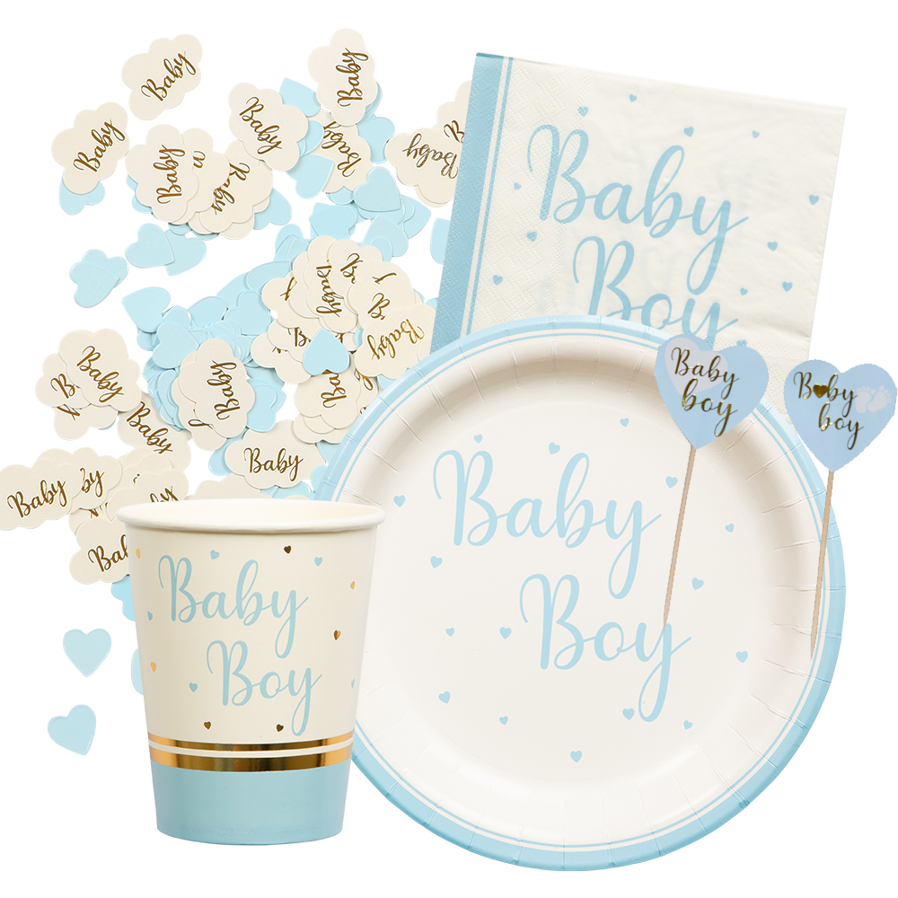 Supersöt dukningsserie med Baby Boy-tema som passar utmärkt till Baby Shower, dop, namngivelse eller 1-års kalas. Den inbjudande ljusblåa färgen bidrar till en varm och härlig stämning. Dukningsserien består av cake-picks, muggar, servetter, tallrikar och konfetti. Artiklarna är gjoda av hållbart papper.