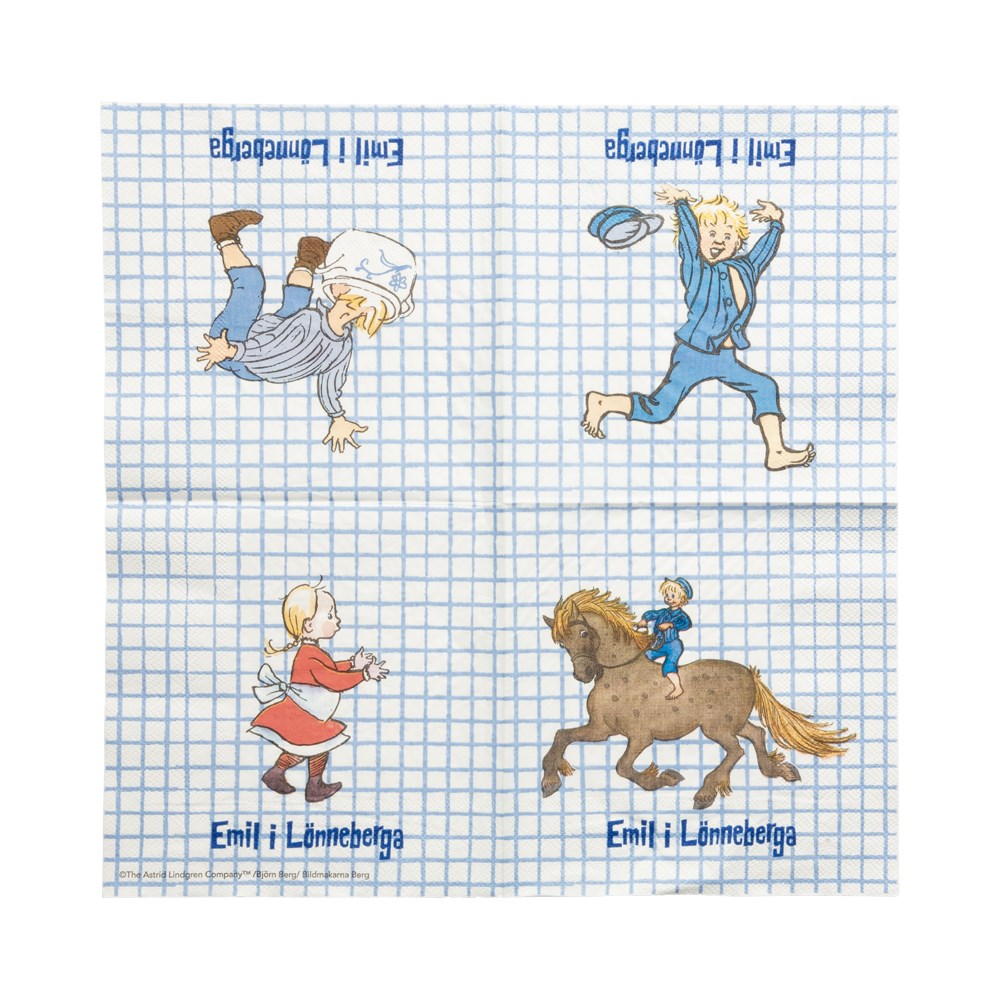 Tre lagersservett  i storlek 33 x 33 cm med festligt Emil motiv. Perfekt att använda som servett på Emilkalaset eller för att sätta lite färg till dukningen.