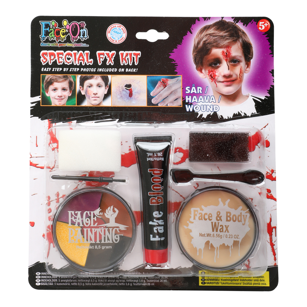 Innehåller oljebaserade ansiktsfärger (gul, svart, rosa, brun och röd), vax för ansikte och kropp (8,5g), vattenbaserat teaterblod (26.1ml), 2st svampar, pensel och plastpatel. Ingredienserna som används i denna produkt klarar standarden för kvalitet. Kan skapa irritation hos känsliga personer. Avbryt om detta uppstår. Barn bör använda denna produkt under överseende av vuxna. Applicera ej på skadad, solbränd, inflammerad eller känslig hud. För att ta bort sminket, torka med papper eller bomullstuss, tvätta med tvål och varmt vatten.