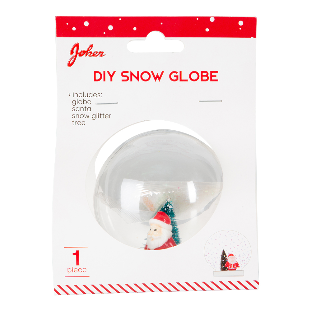 Gör din egen snöglob. Innehåller snöglob, glitter, tomte och gran.1. Öppna locket. 2. Ta ut påsen med glitter. 3. Öppna påsen med glitter och häll ut i globen. 4. Stäng locket och skaka globen. Klart!