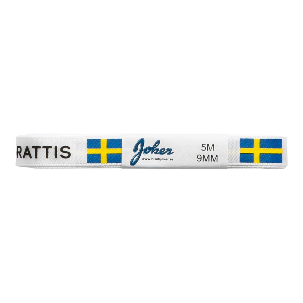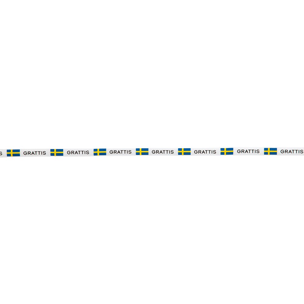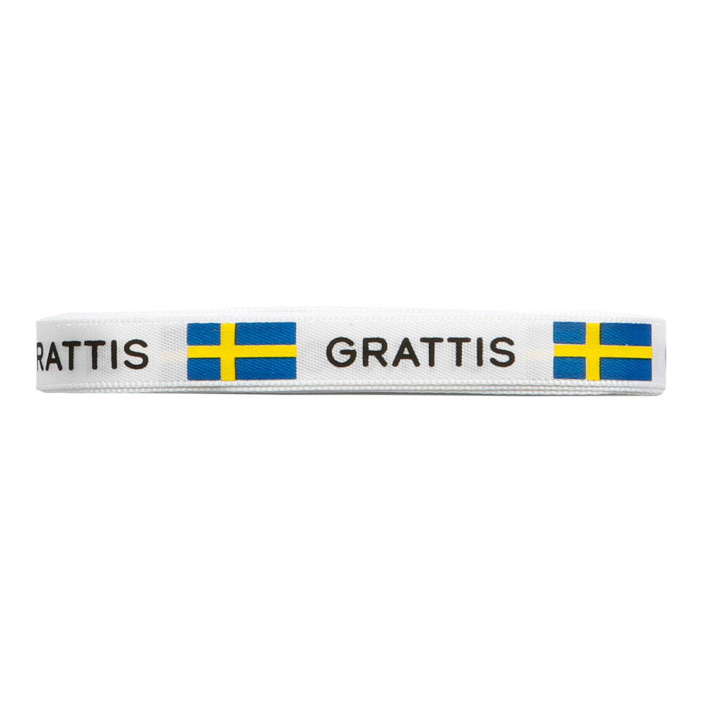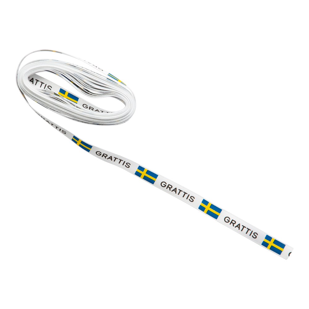 Sidenband 5m x 9mm vitt band med texten Grattis och svenska flaggan tryckt på en sida. Använd för att binda en blomma eller gosedjur till studenten, examen eller när du vill fira någon.
