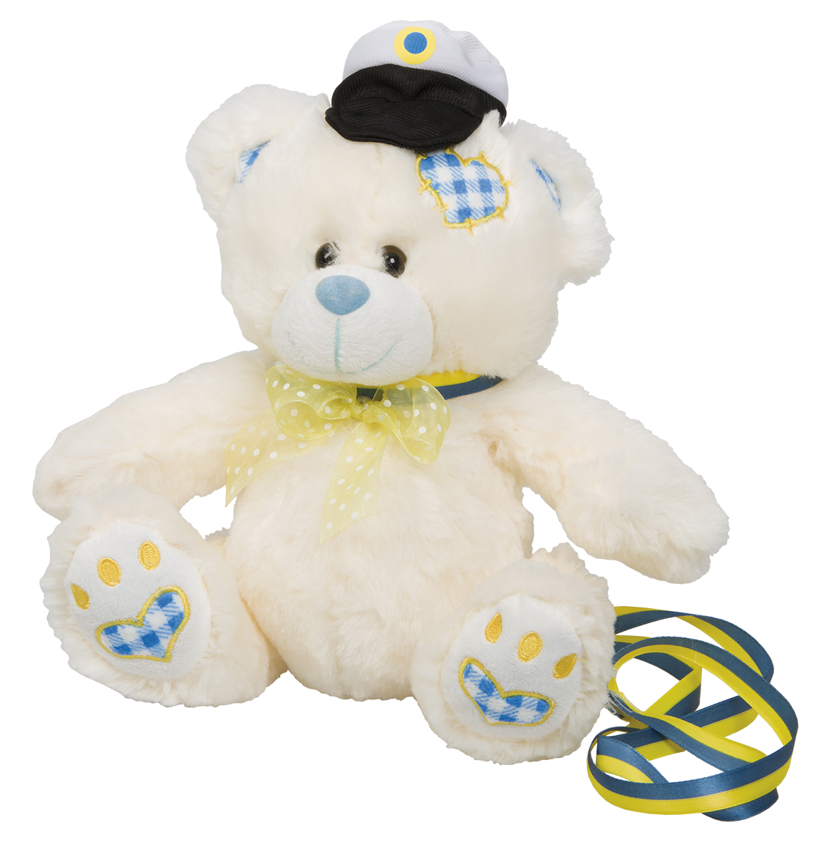 Nalle tillverkad av polyester. Blågult band medföljer.
