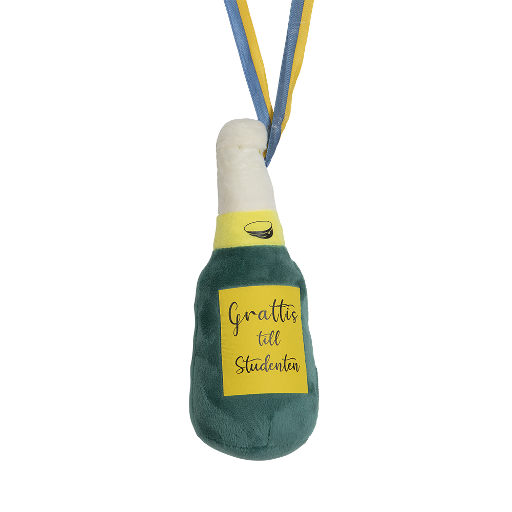 Studentnalle i flaskformat med texten Grattis till Studenten. En festlig gåva att gratulera studenten med på hens stora examensdag. Studentnallen kommer med ett blågult band som gör den perfekt att hängas runt studentens hals. Studentflaskan är ca 20 cm.