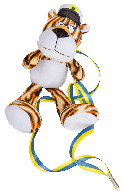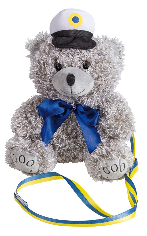 Nalle tillverkad av polyester. Blågult band medföljer.