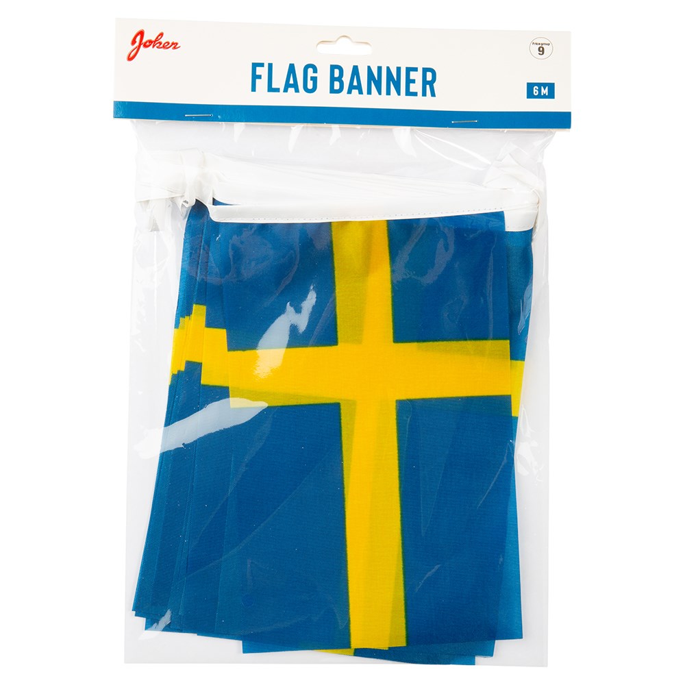 Svensk flaggirlang i tyg på hela 6 meter, en ypperlig dekoration till sommarfesten. Sverigeflaggan gör sig utmärkt till studenten, födelsedagsfirandet, nationaldagsfirandet, midsommarfirandet och till bröllopet. En riktig mångsysslare helt enkelt.